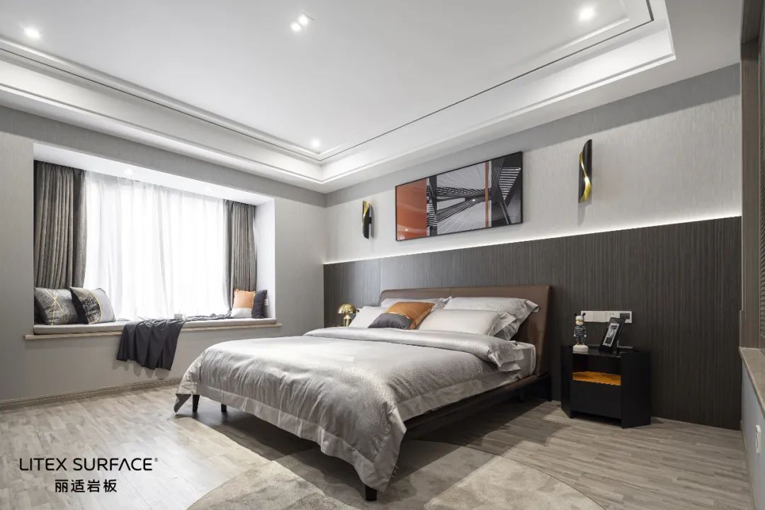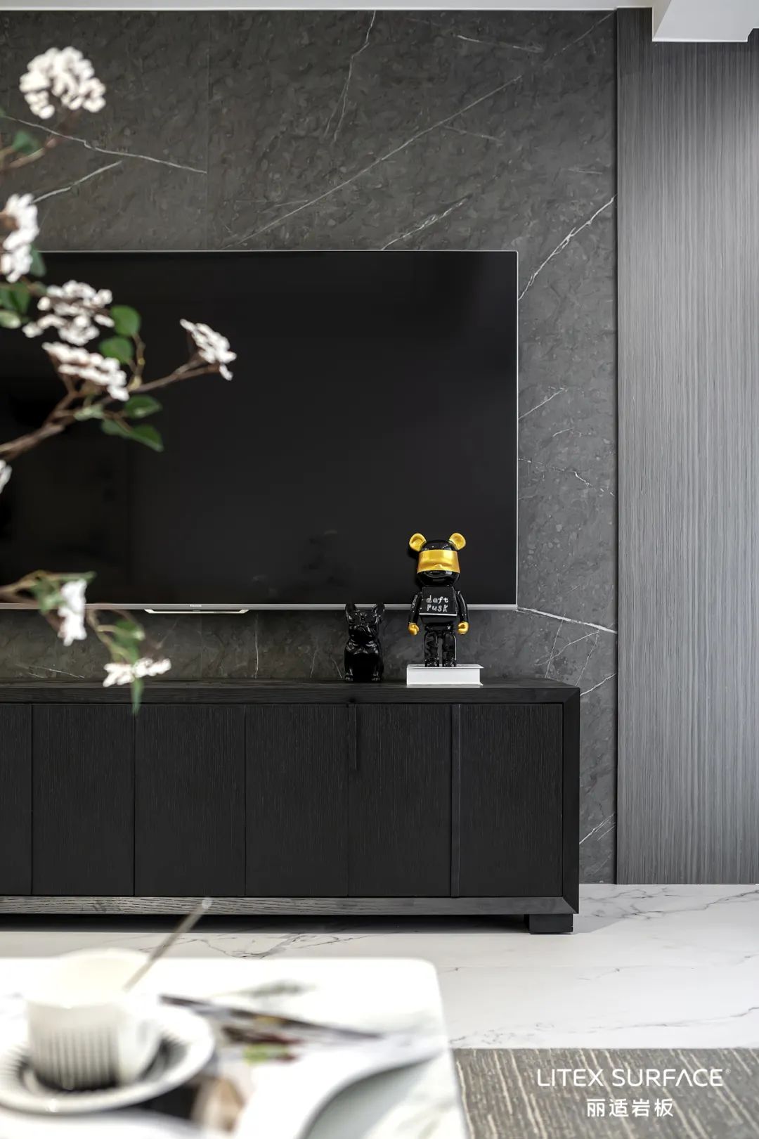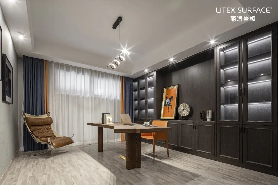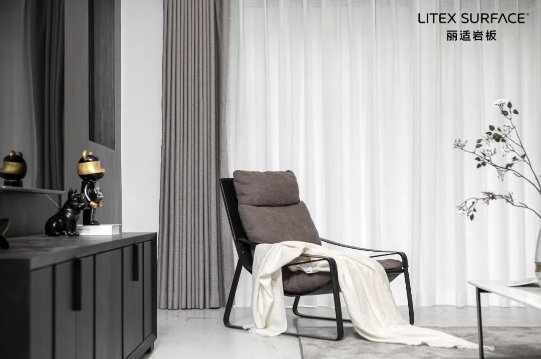黑色橡木与深灰色岩板塑造了空间的高级氛围,统一深色系的设计令空间干净且沉稳,以精致的摆件串联饱满的生活状态,充满艺术品味。