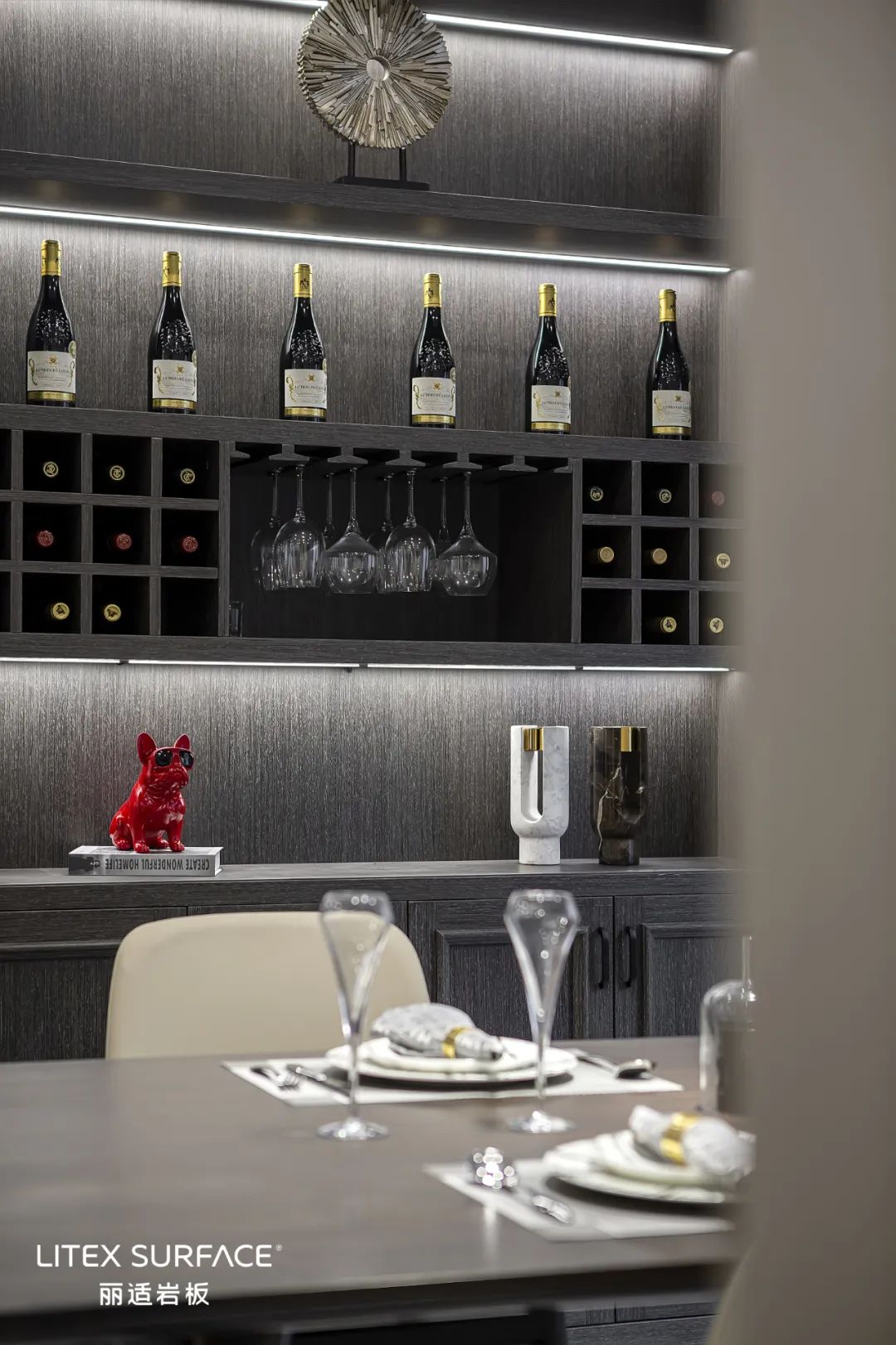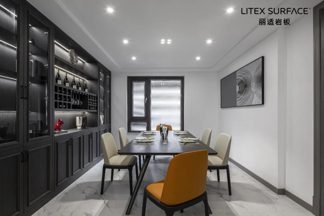 用餐区域延续深沉基调,琳琅满目的酒橱是舒适感的载体,从繁华的世界褪去,回归对生活的追求。