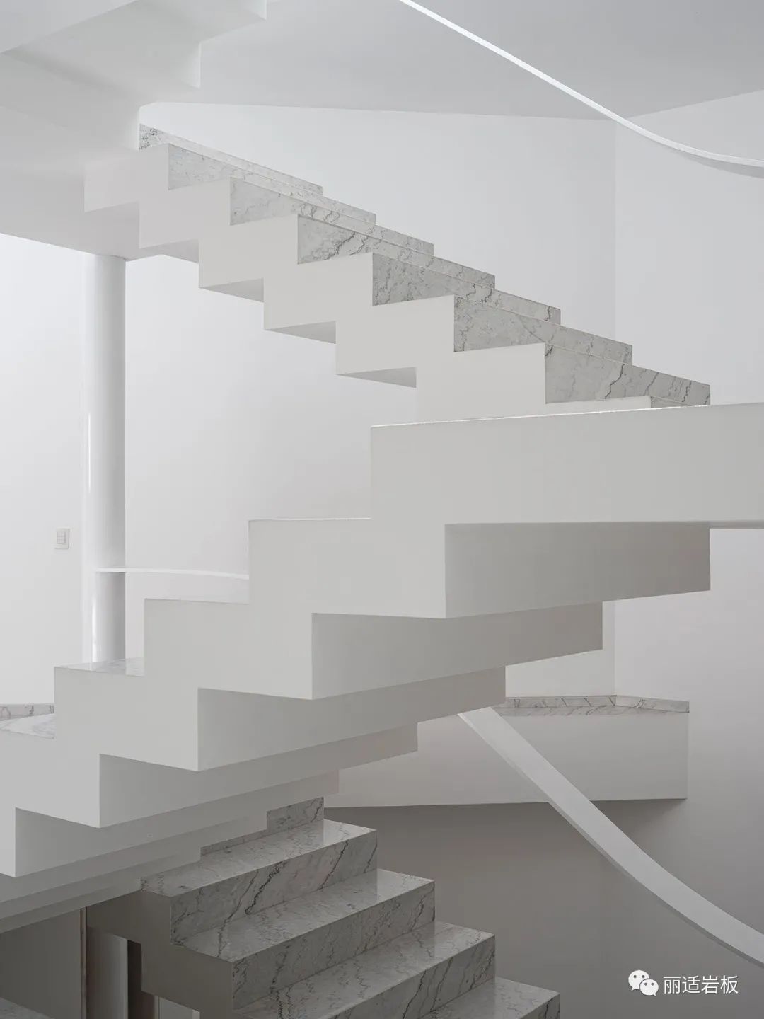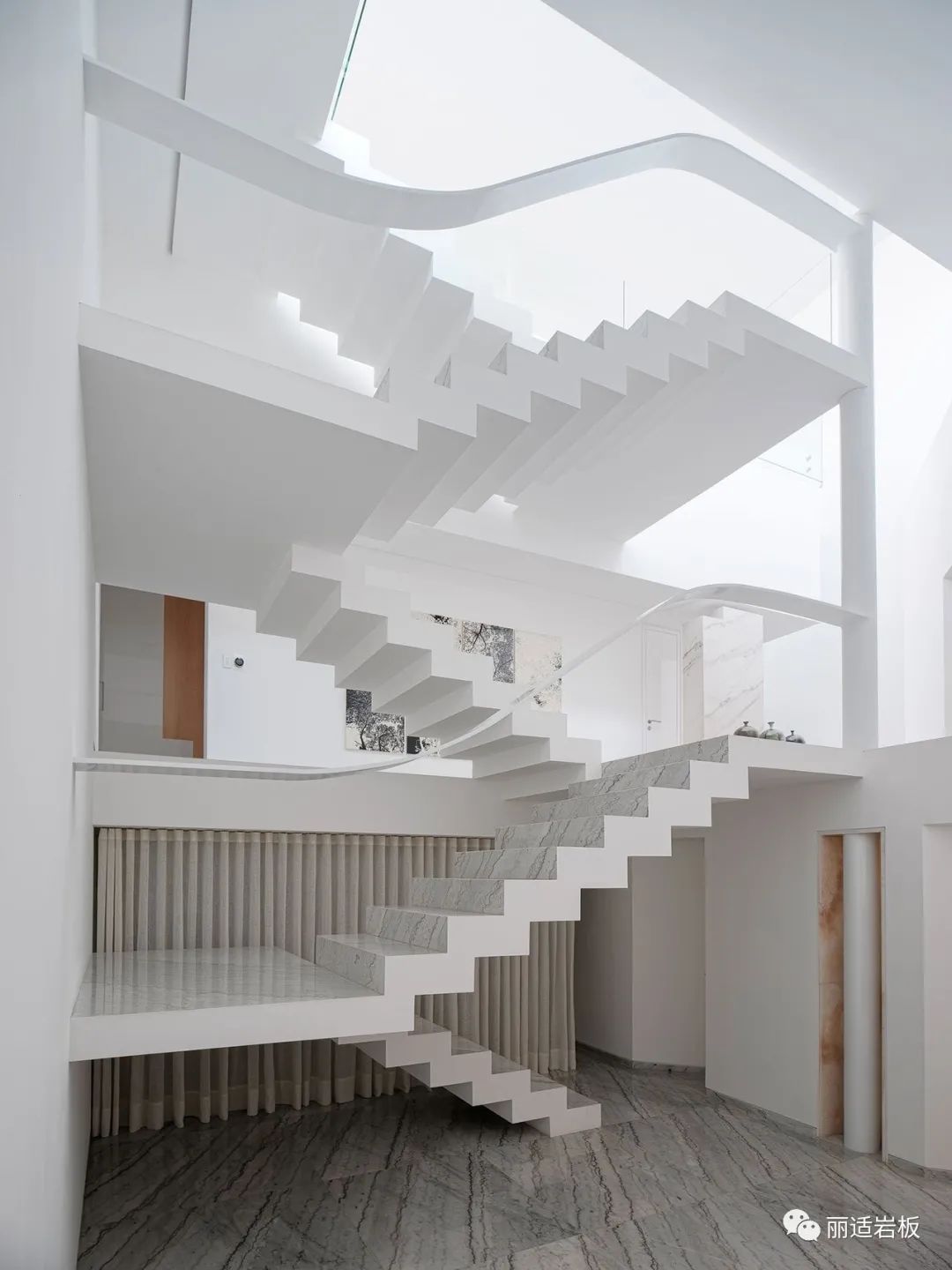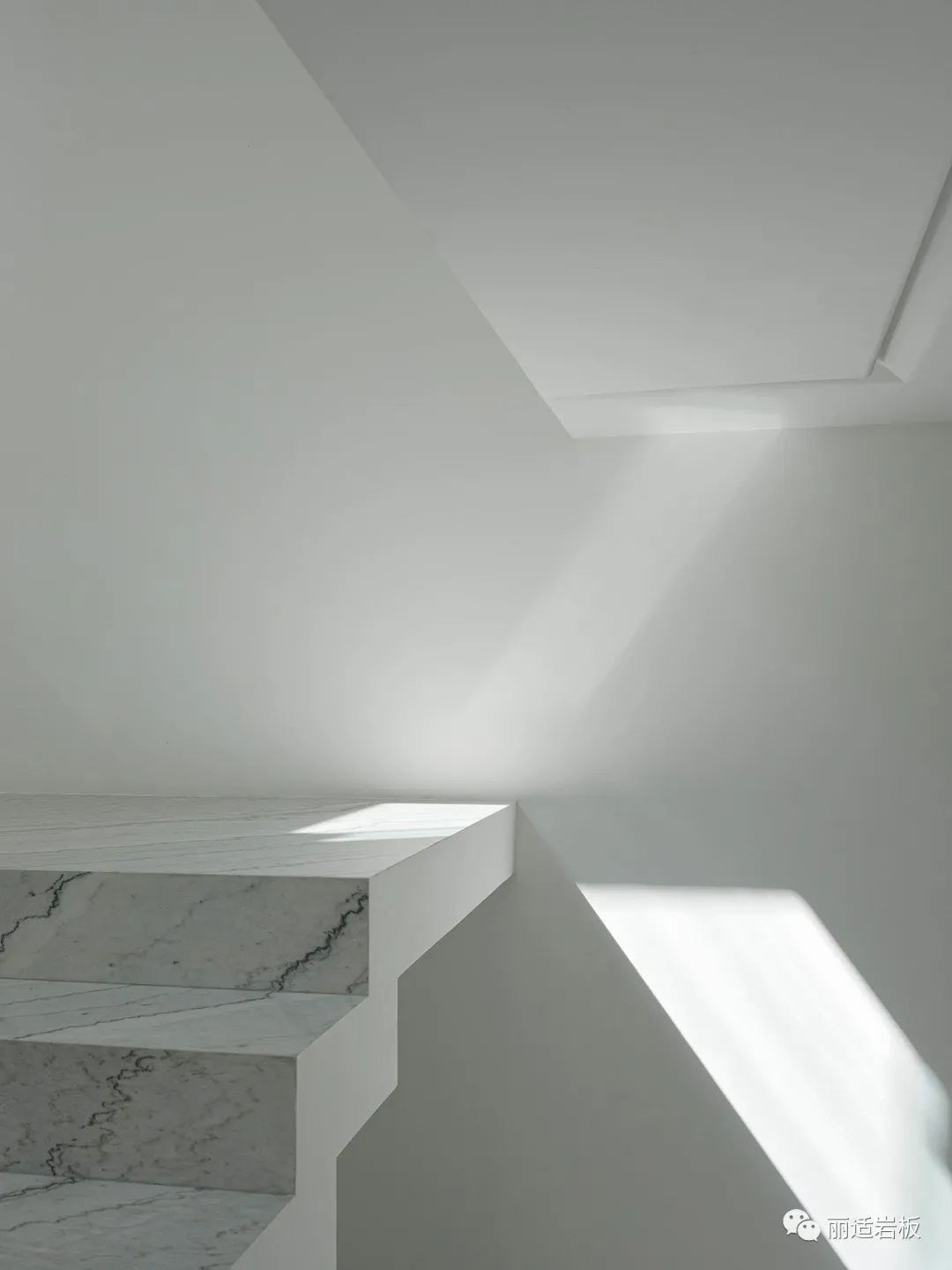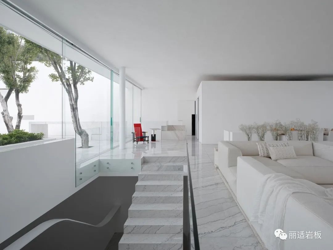 房屋内部的墙地面、内置式家具和台阶等,多采用写意主义的石纹元素材料,拥有自然细腻的温润质地,在整个建筑中建立宽敞的视觉联系。