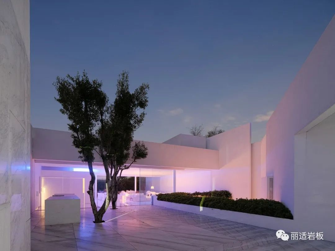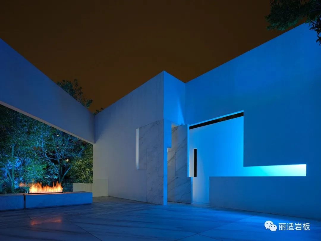 当太阳下山时,漂白的单调调色板用作霓虹灯的白色画布,与饱和的霓虹灯色彩在夜间到来时相呼应,以蓝色、紫色和粉红色的色调诱人地冲洗房屋,在其极富远见的极简主义建筑中从未间断。
