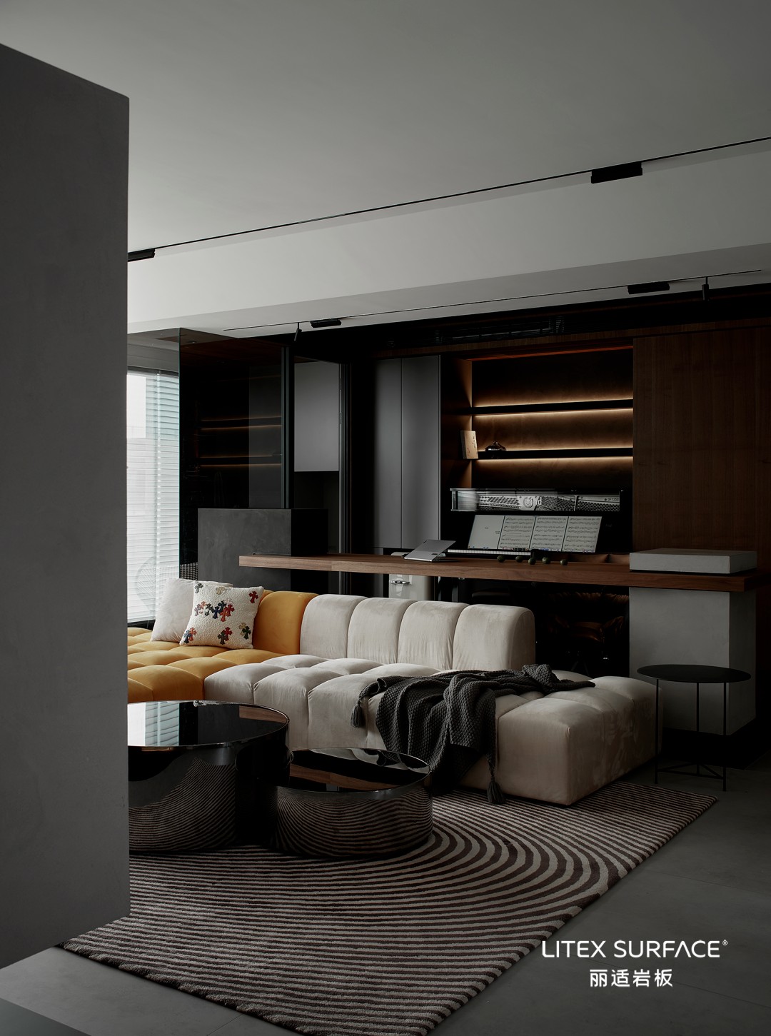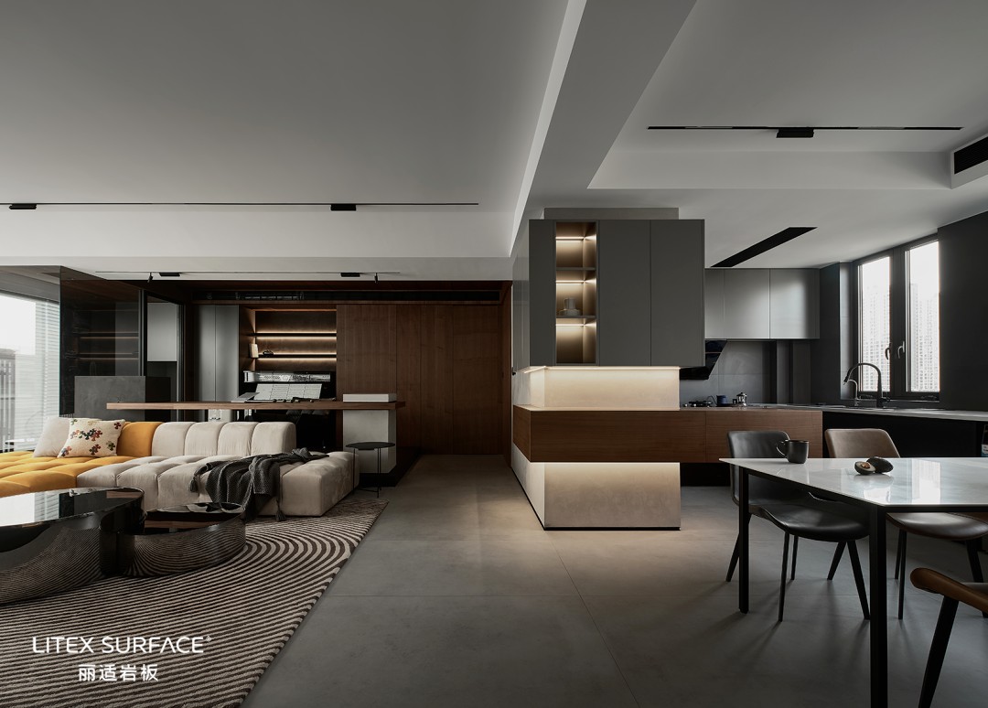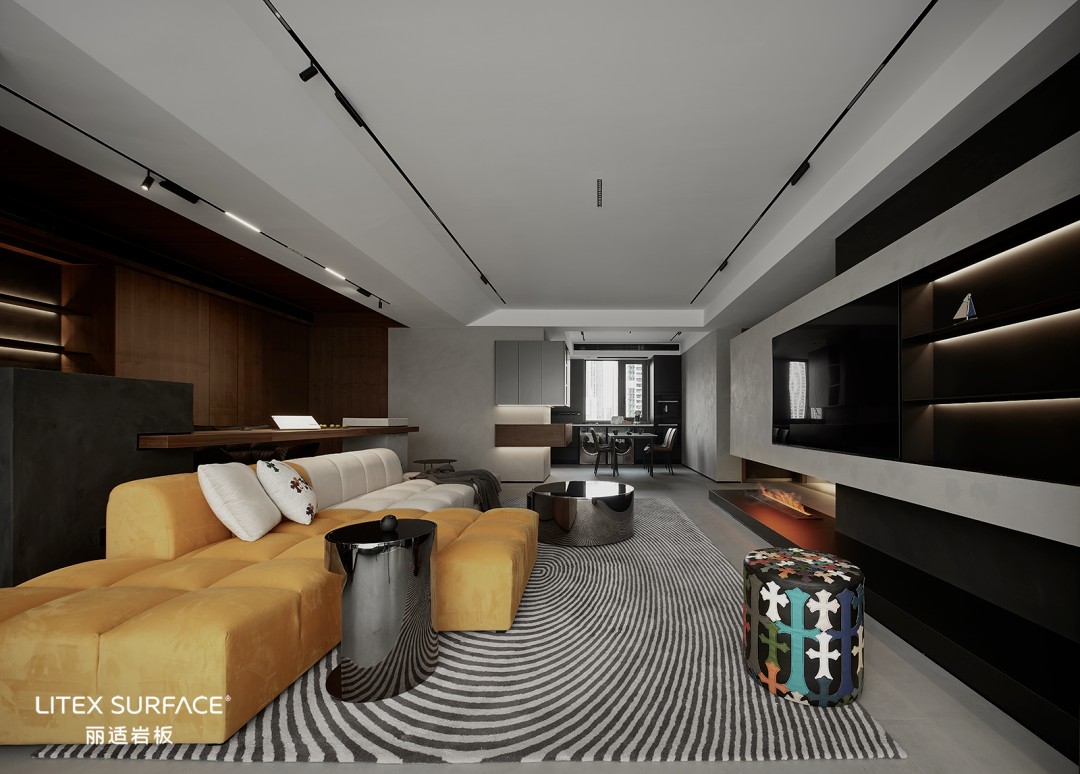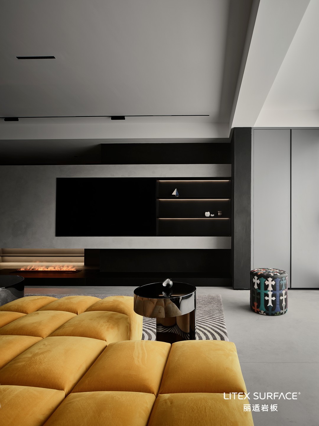 纯黑岩板的大面积应用,与水泥灰岩板形成鲜明的视觉对比,增强空间层次感。