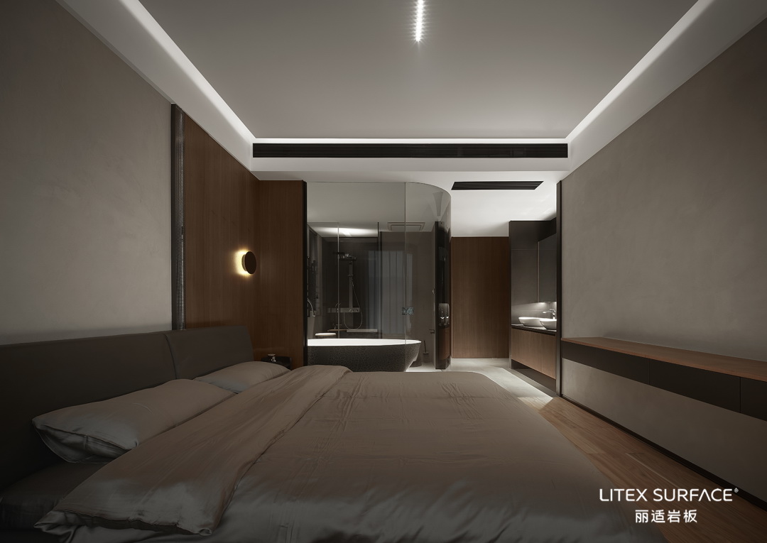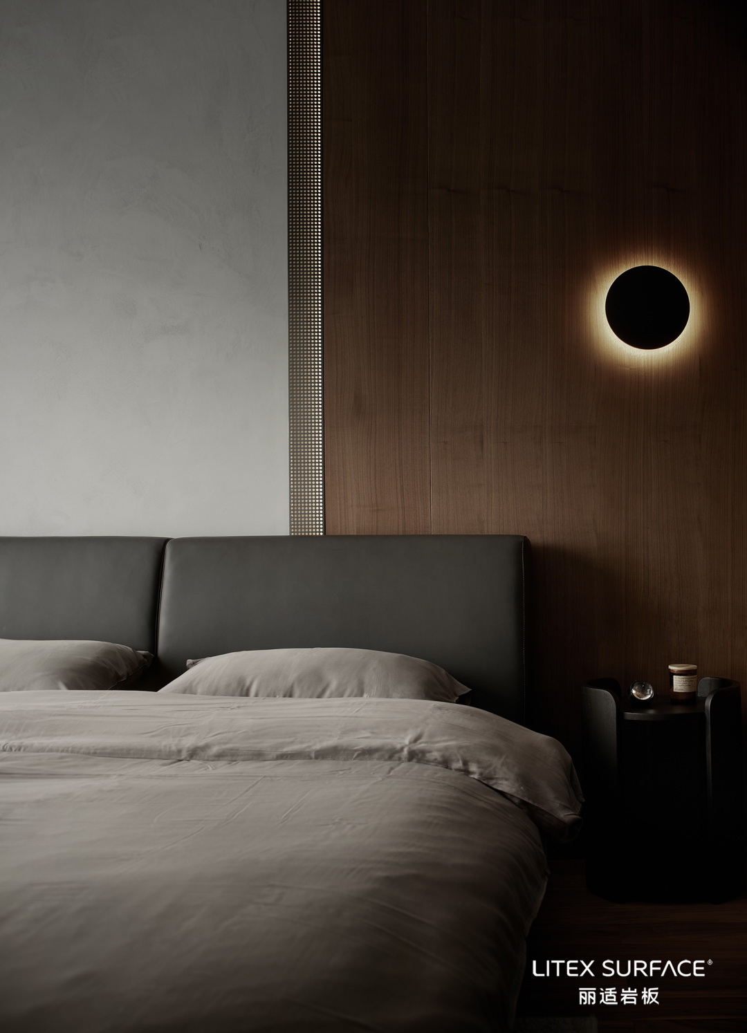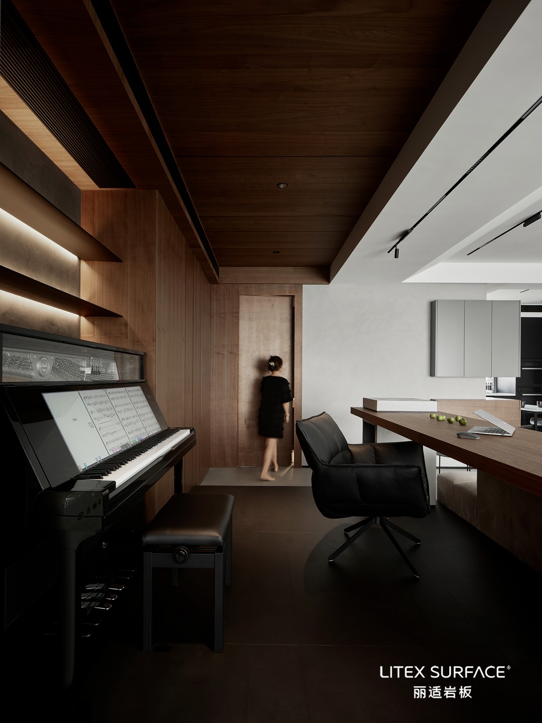 纯黑岩板的大面积应用,与水泥灰岩板形成鲜明的视觉对比,增强空间层次感。